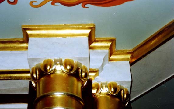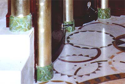 The bases are interpreted from green marble in the floor pattern, and above the column caps and along the ceiling molding is faux white marble.