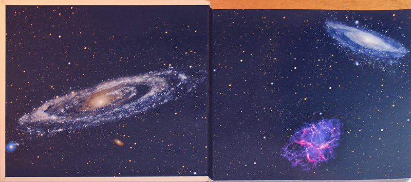 Michigan. The basis of the cover panel is the "Big Dipper," one of the most familiar celestial markers, part of the constellation Ursa Major. It has been used for millenia by explorers because the front two stars in the "bucket," Merak and Dubhe, point to Polaris, the Noth Star, which is the end of the handle in the "Little Dipper" in the constellation Ursa Minor. The design began with a tracing of the positions of the brightest stars in these constellations, and choosing brass tools for dots in sizes that represent the relative magnitudes of the stars. The letters AA are are like two spaceships traveling together through the universe. They start from a familiar place, gold in the bucket of the big dipper. The star chart is a metaphor for the newlyweds to navigate together through the vastness of the unknown. There are many distractions and destinations, represented by three stylized stars in abalone shell and three planets in goatskin. The materials of the cover are from the animal and mineral kingdoms, with the vegetable kingdom represented by the binders' board that is under the skin, the flour paste that attaches the skin to the board, the linen thread and tapes the book is sewn with, and the 100% cotton Rives BFK paper of the book. The three kingdoms work together, and if properly cared for the book can last a thousand years or more. The triangles made by the planets and stars intersect, and are in illusionistic deep space. When imagined in three dimensions, there is a place where the configuration can be viewed as a Mogein Dovid (Magen David), the Star (Shield) of David, a symbol of Jewish identity. Because of the way the abalone reflects light and color, and the tooling of the dots at different angles, the cover elements light up in changing ways depending on the viewing angle and light source. Endpapers were created by combining NASA images of galaxies and nebulae in Photoshop, printing the composite on an Epson R1900 in Ultrachrome II archival pigment inks, and spraying the image with two coats of lacquer, with the topcoat satin finish. The hinges are bookcloth. ![]() Endpapers. Above: front. Below: back